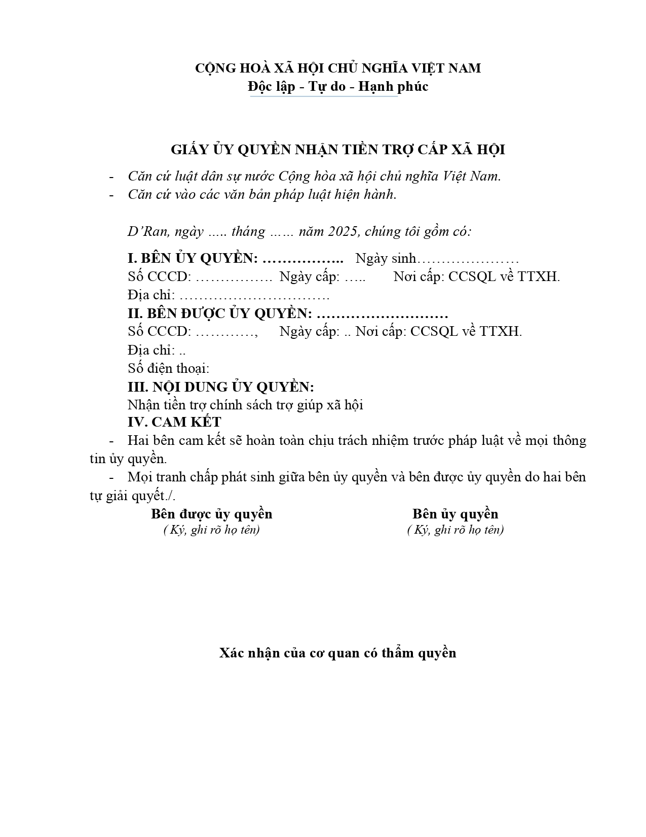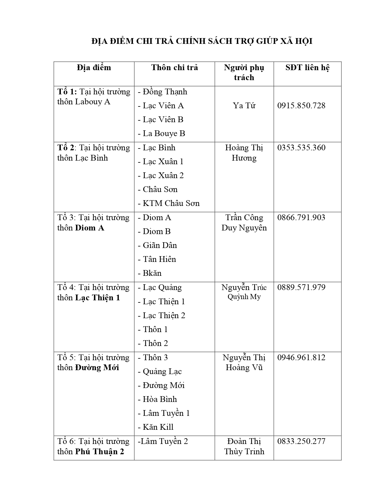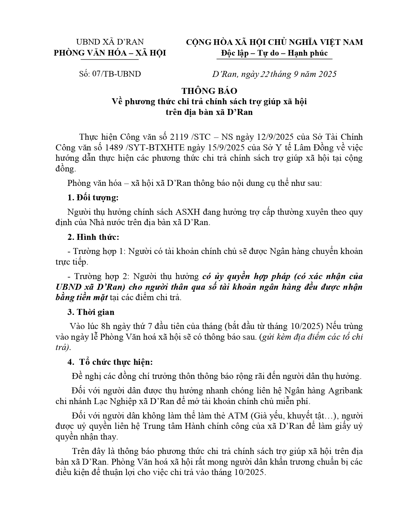 THÔNG BÁO Về phương thức chi trả chính sách trợ giúp xã hội trên địa bàn xã D’Ran
